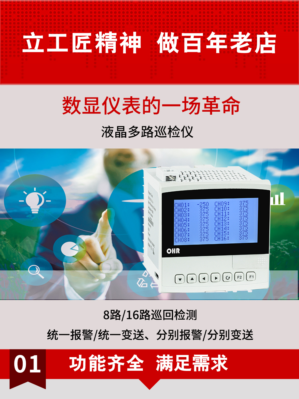 虹潤公司是專業(yè)生產(chǎn)多路溫度巡檢儀的國家專精特新“小巨人”企業(yè),生產(chǎn)的液晶多路巡檢儀,具有8路/16路測量通道,全切換信號輸入,統(tǒng)一報(bào)警統(tǒng)一變送輸出,分別報(bào)警分別變送輸出,RS485/RS232通訊等特點(diǎn)。產(chǎn)品獲得巡回檢測顯示方法及裝置、儀表殼體等2項(xiàng)國家發(fā)明專利,主持起草工業(yè)過程控制系統(tǒng)用模擬輸入兩位或多位輸出儀表、物聯(lián)網(wǎng)智能溫度儀表通用技術(shù)條件等2項(xiàng)國家標(biāo)準(zhǔn),以及通信系統(tǒng)多通道數(shù)據(jù)采集控制終端規(guī)范軍用標(biāo)準(zhǔn),參與國際5G標(biāo)準(zhǔn)制定,取得液晶多回路測量顯示控制儀等4項(xiàng)相關(guān)軟件著作權(quán)。產(chǎn)品廣泛應(yīng)用于電力、石化、冶金、制藥、水處理、機(jī)械配套等各種工業(yè)現(xiàn)場。