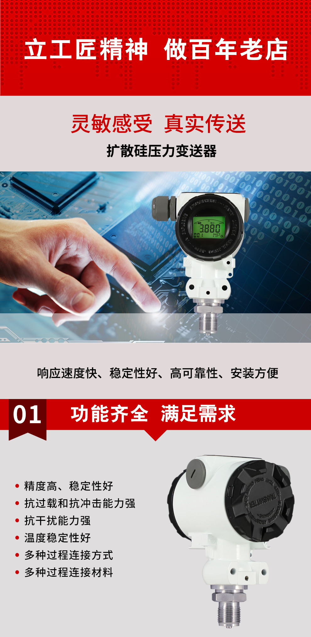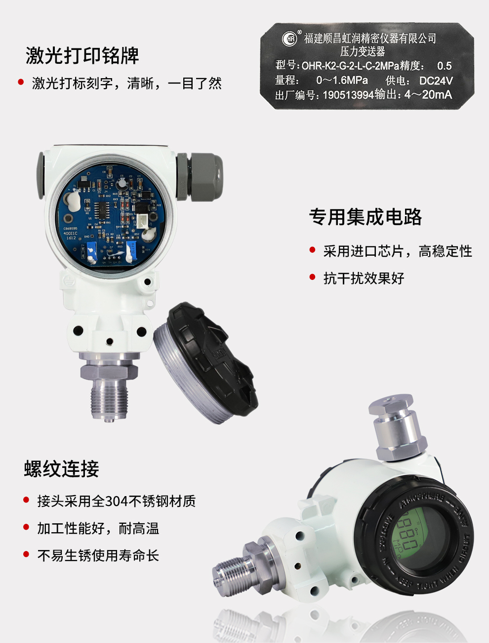 虹潤公司是專業(yè)生產(chǎn)壓力變送器的國家專精特新“小巨人”企業(yè),生產(chǎn)的擴(kuò)散硅壓力變送器,具有精度高,穩(wěn)定性好,響應(yīng)速度快,高可靠性,抗過載和抗沖擊能力強,安裝方便等特點。產(chǎn)品獲得一種數(shù)字顯示低功耗壓力表、一種信號發(fā)生器裝置等2項國家發(fā)明專利,主持起草工業(yè)過程控制系統(tǒng)用模擬輸入兩位或多位輸出儀表、工業(yè)過程測量和控制系統(tǒng)用壓力/差壓變送器等2項國家標(biāo)準(zhǔn),通信系統(tǒng)多通道數(shù)據(jù)采集控制終端規(guī)范軍用標(biāo)準(zhǔn),以及現(xiàn)場設(shè)備集成等5項智能制造國家標(biāo)準(zhǔn)。參與國際5G標(biāo)準(zhǔn)制定,取得數(shù)顯壓力表等2項相關(guān)軟件著作權(quán)。產(chǎn)品廣泛應(yīng)用于化工、食品、制藥、電力、設(shè)備配套、供暖、水處理、樓宇等行業(yè),需精準(zhǔn)測量流體壓力的現(xiàn)場。