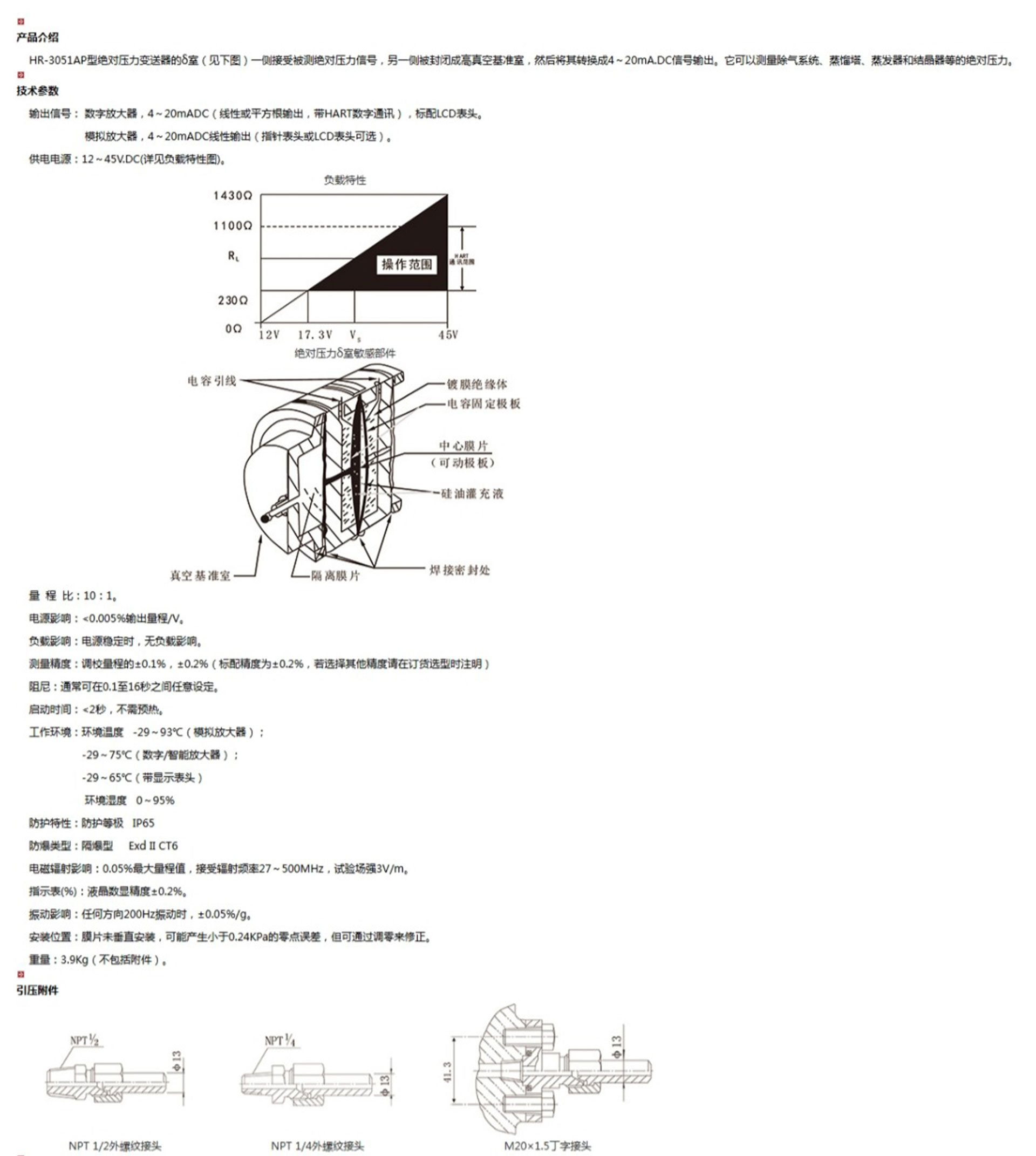 HR-3051AP型絕對壓力變送器的δ室(見下圖)一側(cè)接受被測絕對壓力信號,另一側(cè)被封閉成高真空基準(zhǔn)室,然后將其轉(zhuǎn)換成4~20mA.DC信號輸出。它可以測量除氣系統(tǒng)、蒸餾塔、蒸發(fā)器和結(jié)晶器等的絕對壓力。