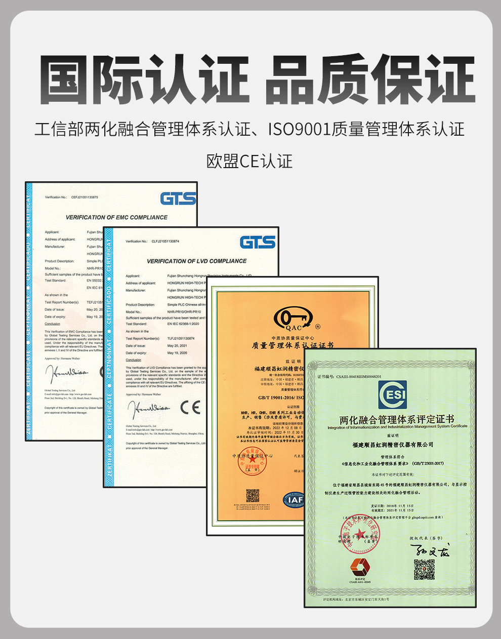 虹潤公司是專業(yè)生產(chǎn)PLC控制器的國家專精特新“小巨人”企業(yè)。生產(chǎn)的簡易PLC中文一體機,具有全中文編程,專業(yè)邏輯控制與時間控制,全隔離設計,遠程RS485通訊監(jiān)測等特點。產(chǎn)品獲得智能化控制器、多通道可編程繼電器等2項國家發(fā)明專利;主持起草流程工業(yè)中電氣/儀表和控制系統(tǒng)的試車國家標準,通信系統(tǒng)多通道數(shù)據(jù)采集控制終端規(guī)范軍用標準,以及現(xiàn)場設備集成等5項智能制造國家標準,參與國際5G標準制定,取得中文可編程繼電器等2項相關軟件著作權。產(chǎn)品廣泛應用于實驗室、市政工程、農(nóng)業(yè)養(yǎng)殖、包裝機械、食品行業(yè)、樓宇自控等諸多領域。