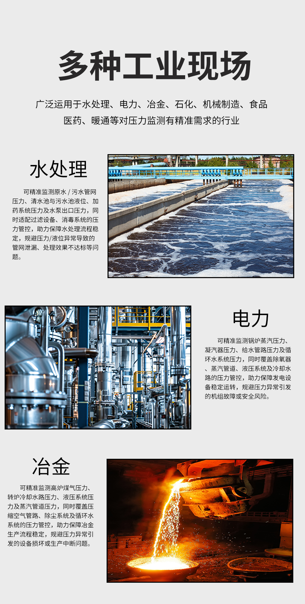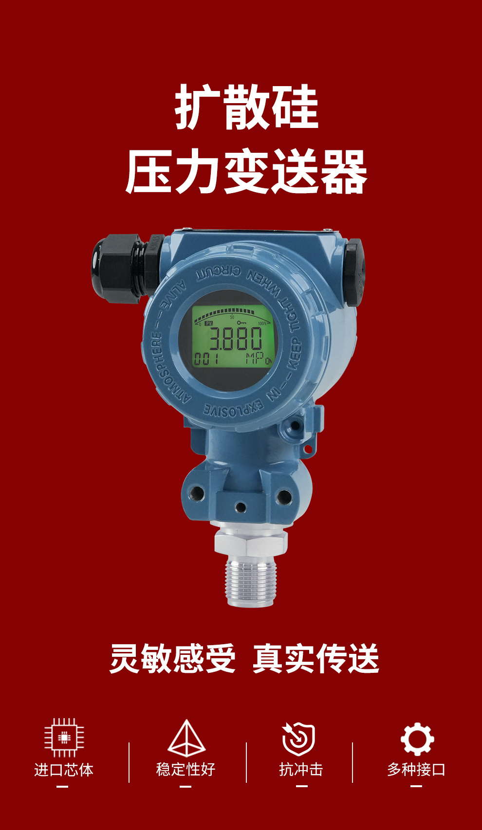 虹潤公司是專業(yè)生產(chǎn)壓力變送器的國家專精特新“小巨人”企業(yè),生產(chǎn)的擴散硅壓力變送器,具有精度高,穩(wěn)定性好,響應(yīng)速度快,高可靠性,抗過載和抗沖擊能力強,安裝方便等特點。產(chǎn)品獲得一種數(shù)字顯示低功耗壓力表、一種信號發(fā)生器裝置等2項國家發(fā)明專利,主持起草工業(yè)過程控制系統(tǒng)用模擬輸入兩位或多位輸出儀表、工業(yè)過程測量和控制系統(tǒng)用壓力/差壓變送器等2項國家標(biāo)準(zhǔn),通信系統(tǒng)多通道數(shù)據(jù)采集控制終端規(guī)范軍用標(biāo)準(zhǔn),以及現(xiàn)場設(shè)備集成等5項智能制造國家標(biāo)準(zhǔn)。參與國際5G標(biāo)準(zhǔn)制定,取得數(shù)顯壓力表等2項相關(guān)軟件著作權(quán)。產(chǎn)品廣泛應(yīng)用于化工、食品、制藥、電力、設(shè)備配套、供暖、水處理、樓宇等行業(yè),需精準(zhǔn)測量流體壓力的現(xiàn)場。