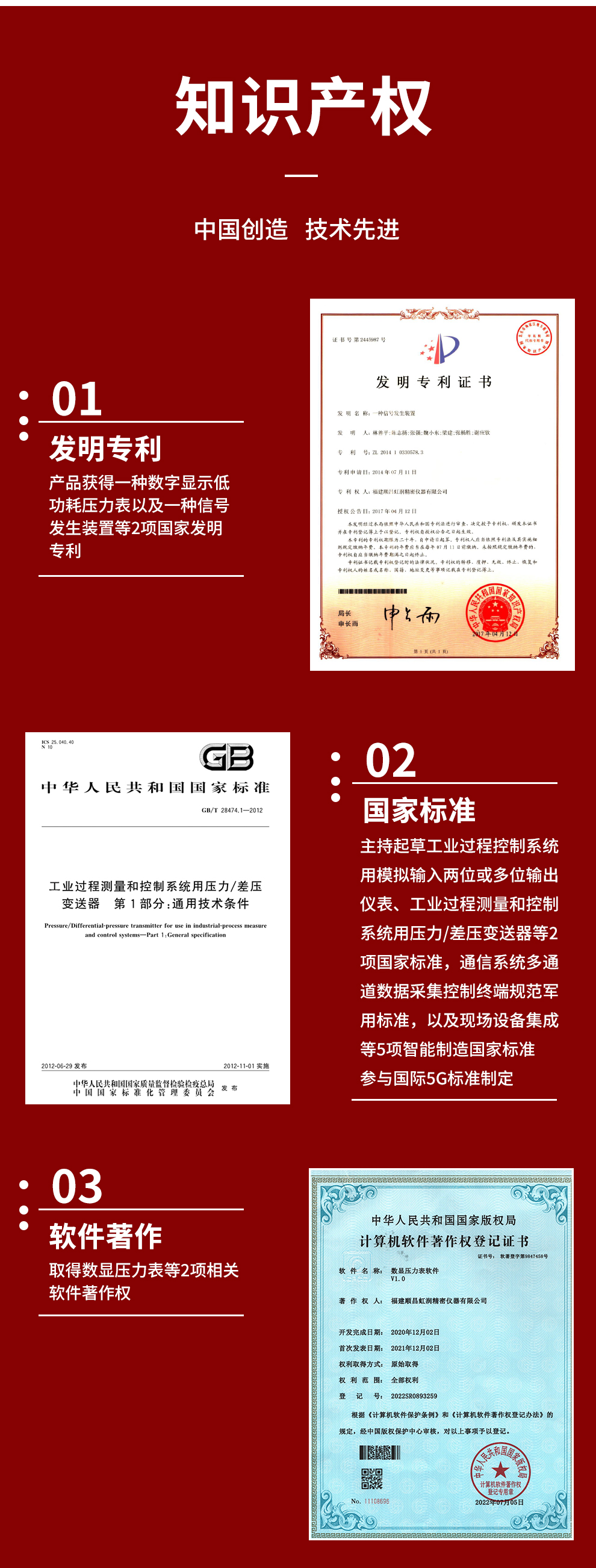 虹潤公司是專業(yè)生產(chǎn)數(shù)顯壓力表的國家專精特新“小巨人”企業(yè)。生產(chǎn)的智能數(shù)字壓力表,具有氣體液體通用,測量精度高,自動(dòng)溫度補(bǔ)償,響應(yīng)速度快,電池供電低功耗漂移小等特點(diǎn)。產(chǎn)品獲得一種數(shù)字顯示低功耗壓力表以及一種信號發(fā)生裝置等2項(xiàng)國家發(fā)明專利,主持起草工業(yè)過程控制系統(tǒng)用模擬輸入兩位或多位輸出儀表、工業(yè)過程測量和控制系統(tǒng)用壓力/差壓變送器等2項(xiàng)國家標(biāo)準(zhǔn),通信系統(tǒng)多通道數(shù)據(jù)采集控制終端規(guī)范軍用標(biāo)準(zhǔn),以及現(xiàn)場設(shè)備集成等5項(xiàng)智能制造國家標(biāo)準(zhǔn),參與國際5G標(biāo)準(zhǔn)制定,取得數(shù)顯壓力表等2項(xiàng)相關(guān)軟件著作權(quán)。產(chǎn)品廣泛石化、冶金、電力、制藥、食品、航空航天、工業(yè)循環(huán)水系統(tǒng)等諸多領(lǐng)域。
