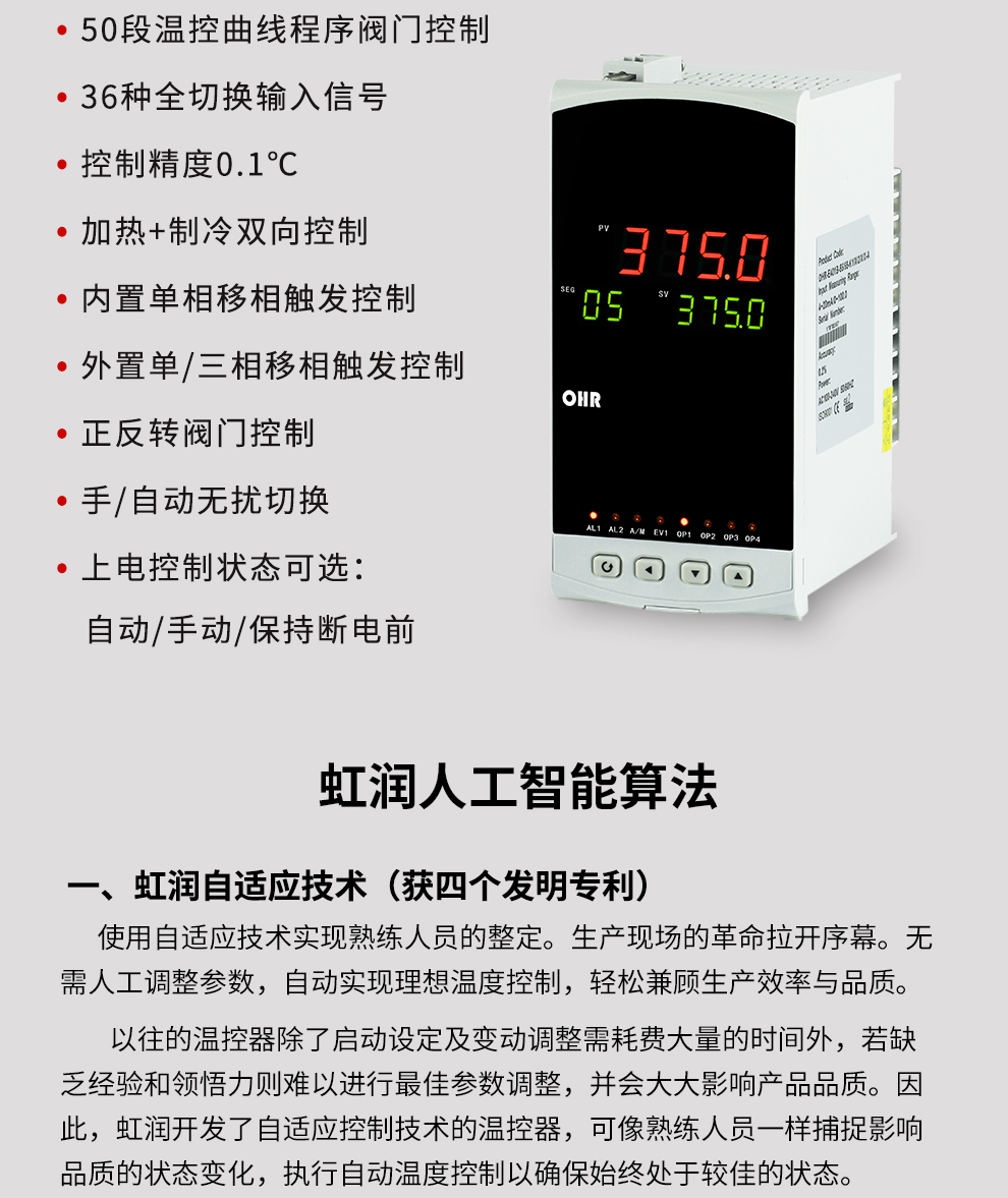 OHR-E401系列程序閥門(mén)溫控器/調(diào)節(jié)儀采用真正的人工智能算式,儀表啟動(dòng)自整定功能,可以根據(jù)被控對(duì)象的特性,自動(dòng)尋找最優(yōu)參數(shù)以達(dá)到很好的控制效果,無(wú)需人工整定參數(shù)。控溫精度基本達(dá)±0.1℃,無(wú)超調(diào)、欠調(diào),達(dá)國(guó)際先進(jìn)水平。