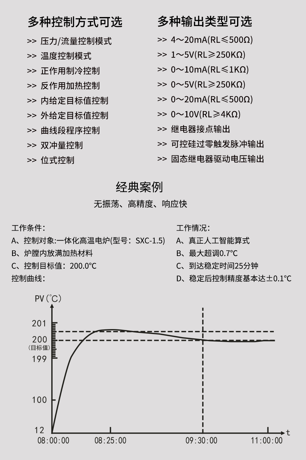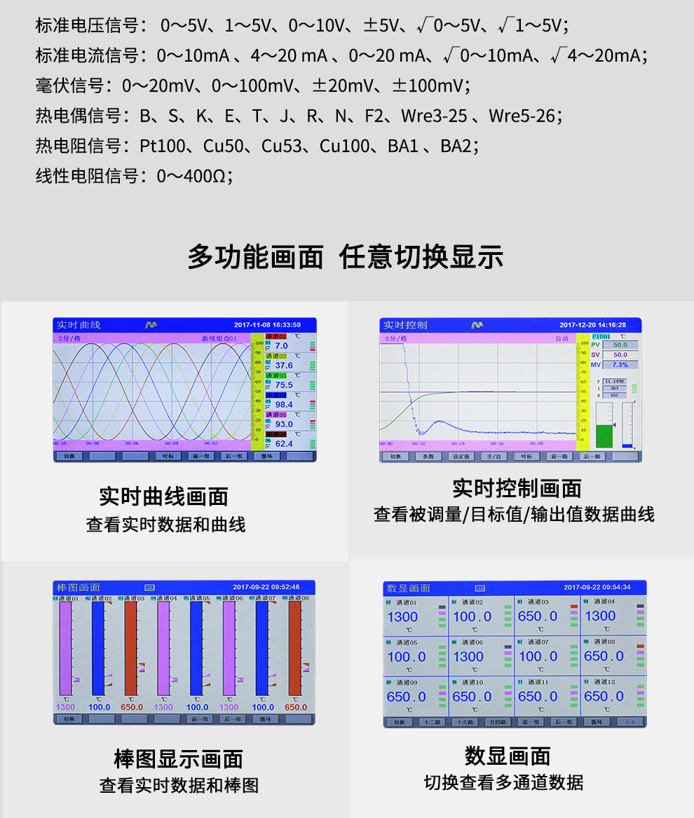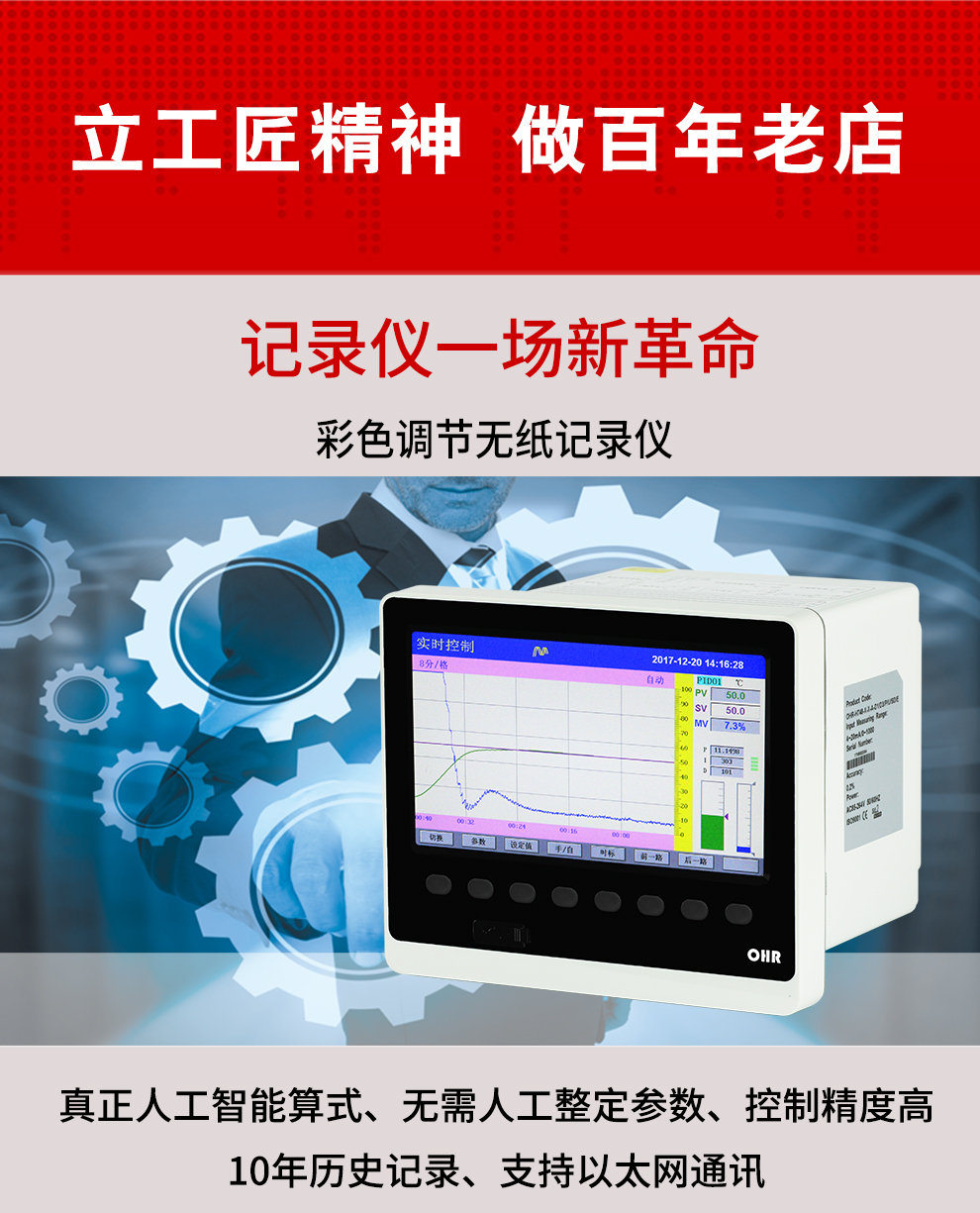 OHR-H300系列彩色調(diào)節(jié)無(wú)紙記錄儀采用真正的人工智能算式,儀表啟動(dòng)自整定功能,可根據(jù)被控對(duì)象的特性,自動(dòng)尋找最優(yōu)參數(shù)以達(dá)到很好的控制效果,無(wú)需人工整定參數(shù)??販鼐然具_(dá)±0.1℃,無(wú)超調(diào)、欠調(diào),達(dá)國(guó)際先進(jìn)水平。24路萬(wàn)能輸入(可組態(tài)選擇輸入:標(biāo)準(zhǔn)電壓、標(biāo)準(zhǔn)電流、熱電偶、熱電阻、毫伏等)其中可帶8路控制輸入。