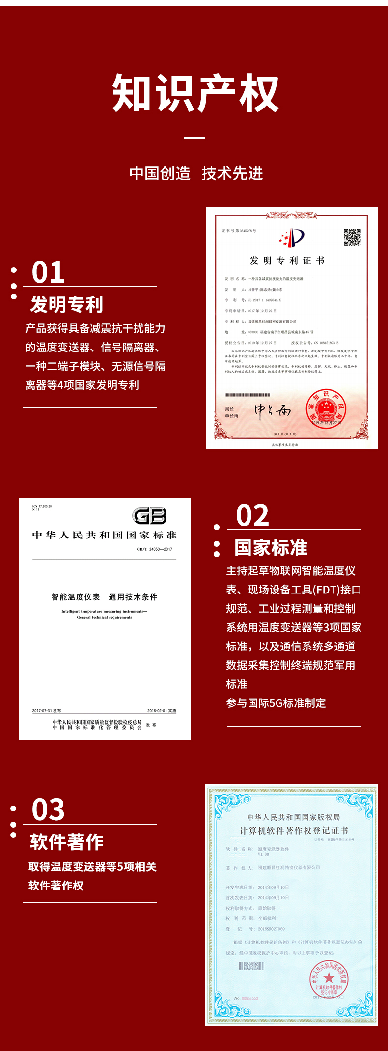 虹潤(rùn)公司是專業(yè)生產(chǎn)溫度變送器的國(guó)家專精特新“小巨人”企業(yè)。生產(chǎn)的溫度變送器,具有采用磁隔離技術(shù),配套編程器可修改參數(shù),抗干擾能力強(qiáng),穩(wěn)定性好,帶RS485或HART通訊等特點(diǎn)。該產(chǎn)品不僅通過HART基金會(huì)認(rèn)證、德國(guó)萊茵 CE 認(rèn)證與 SIL 功能安全認(rèn)證,還獲得具備減震抗干擾能力的溫度變送器、信號(hào)隔離器、一種二端子模塊、無源信號(hào)隔離器等4項(xiàng)國(guó)家發(fā)明專利,主持起草物聯(lián)網(wǎng)智能溫度儀表、現(xiàn)場(chǎng)設(shè)備工具(FDT)接口規(guī)范、工業(yè)過程測(cè)量和控制系統(tǒng)用溫度變送器等3項(xiàng)國(guó)家標(biāo)準(zhǔn),以及通信系統(tǒng)多通道數(shù)據(jù)采集控制終端規(guī)范軍用標(biāo)準(zhǔn),參與國(guó)際5G標(biāo)準(zhǔn)制定,取得溫度變送器等5項(xiàng)相關(guān)軟件著作權(quán)。產(chǎn)品廣泛應(yīng)用于石油、電力、化工,冶金、制藥、紡織、橡膠制造等工業(yè)領(lǐng)域現(xiàn)場(chǎng)自動(dòng)化測(cè)溫過程。