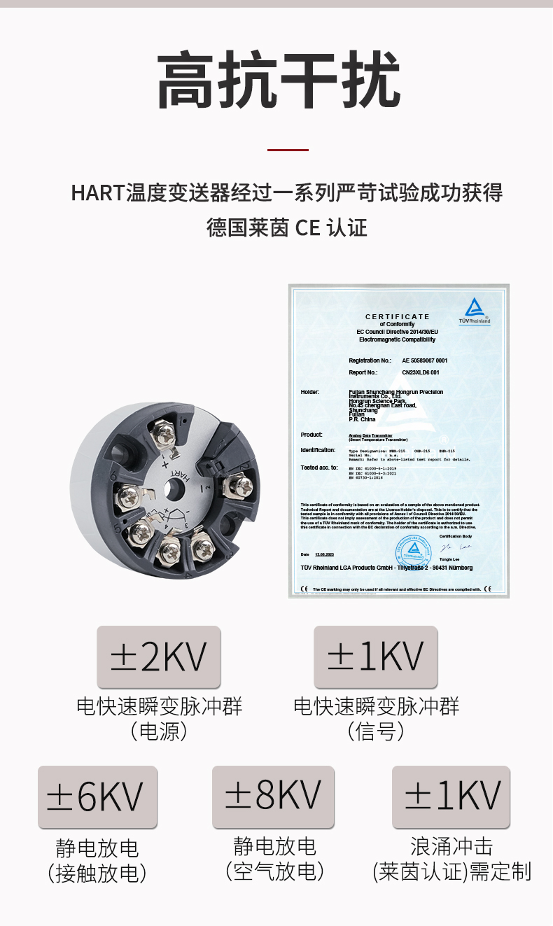 虹潤公司是專業(yè)生產(chǎn)溫度變送器的國家專精特新“小巨人”企業(yè)。生產(chǎn)的智能溫度變送器,具有適配各類溫度傳感器,精度高,穩(wěn)定性好,通過編程線修改輸入信號類型及量程,高抗干擾等特點(diǎn)。該產(chǎn)品不僅通過HART基金會(huì)認(rèn)證、德國萊茵 CE 認(rèn)證與 SIL 功能安全認(rèn)證,還獲得具備減震抗干擾能力的溫度變送器、信號隔離器、一種二端子模塊、無源信號隔離器等4項(xiàng)國家發(fā)明專利,主持起草物聯(lián)網(wǎng)智能溫度儀表、現(xiàn)場設(shè)備工具(FDT)接口規(guī)范、工業(yè)過程測量和控制系統(tǒng)用溫度變送器等3項(xiàng)國家標(biāo)準(zhǔn),以及通信系統(tǒng)多通道數(shù)據(jù)采集控制終端規(guī)范軍用標(biāo)準(zhǔn),參與國際5G標(biāo)準(zhǔn)制定,取得智能溫度變送器、HART溫度變送器等3項(xiàng)相關(guān)軟件著作權(quán)。產(chǎn)品廣泛應(yīng)用于石油、化工、電力、冶金、制藥、食品、水處理等各種工業(yè)領(lǐng)域。