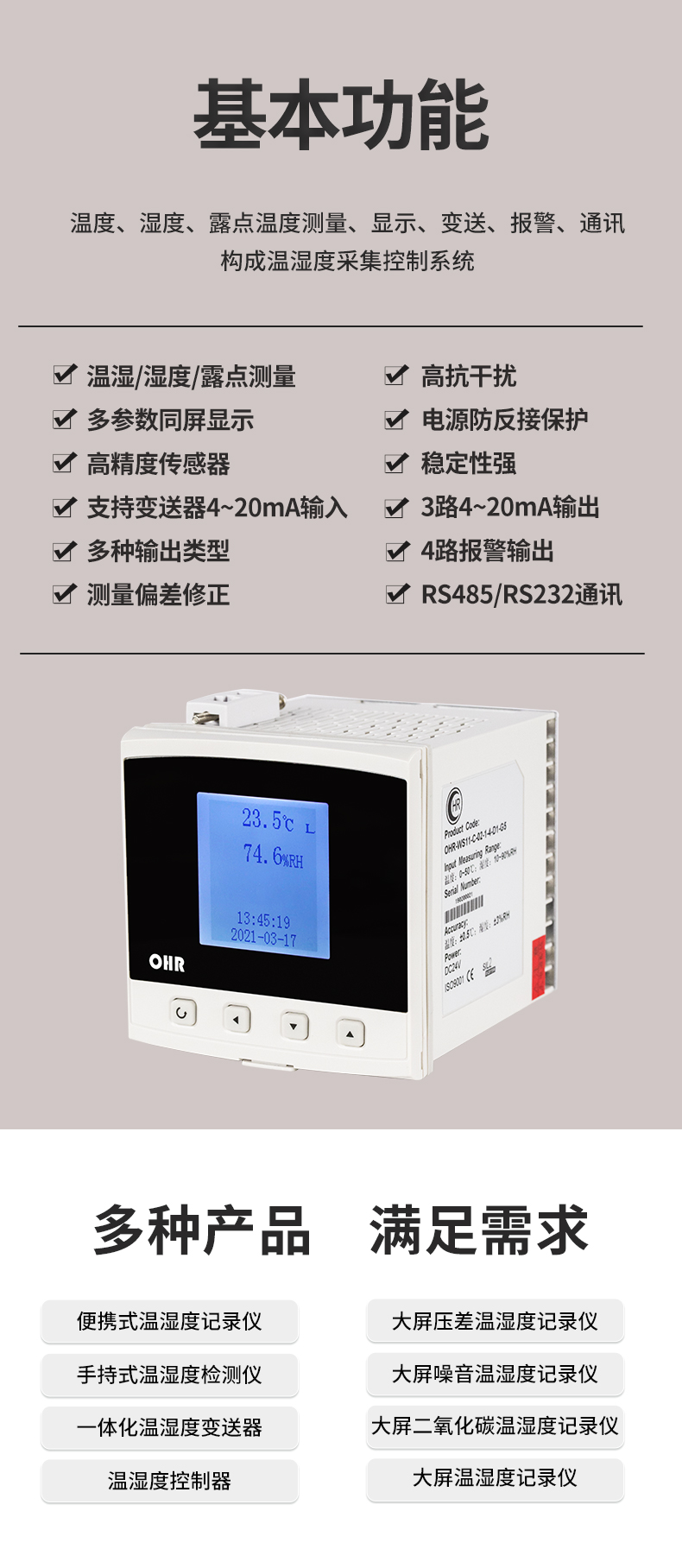 虹潤(rùn)公司是專(zhuān)業(yè)生產(chǎn)環(huán)境監(jiān)測(cè)儀表的國(guó)家專(zhuān)精特新“小巨人”企業(yè)。生產(chǎn)的壁掛式溫濕度控制器,具有溫度、濕度、露點(diǎn)高精準(zhǔn)的測(cè)量,多種輸出類(lèi)型,穩(wěn)定性強(qiáng),RS485/RS232通訊,IP65防護(hù)等級(jí)等特點(diǎn)。產(chǎn)品獲得一種手持式低功耗溫濕度檢測(cè)儀、大屏幕溫濕度記錄儀等2項(xiàng)國(guó)家發(fā)明專(zhuān)利,主持起草物聯(lián)網(wǎng)智能溫度儀表通用技術(shù)條件、冷鏈溫度記錄儀等2項(xiàng)國(guó)家標(biāo)準(zhǔn),通信系統(tǒng)多通道數(shù)據(jù)采集控制終端規(guī)范軍用標(biāo)準(zhǔn),以及現(xiàn)場(chǎng)設(shè)備集成等5項(xiàng)智能制造國(guó)家標(biāo)準(zhǔn),參與國(guó)際5G標(biāo)準(zhǔn)制定,取得溫濕度儀表等2項(xiàng)相關(guān)軟件著作權(quán)。產(chǎn)品廣泛應(yīng)用于工業(yè)現(xiàn)場(chǎng)、農(nóng)業(yè)大棚、倉(cāng)儲(chǔ)物流、地下管廊、養(yǎng)殖孵化、配電機(jī)房等諸多領(lǐng)域。