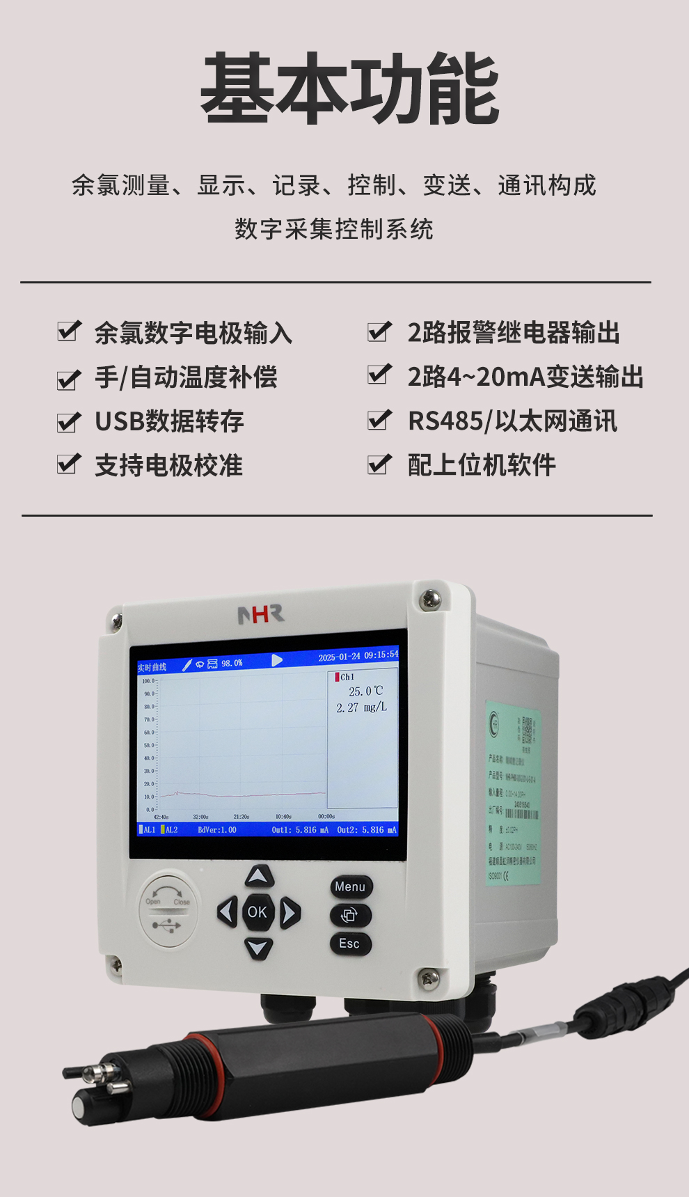 虹潤(rùn)公司是專業(yè)生產(chǎn)水質(zhì)分析儀的國(guó)家專精特新“小巨人”企業(yè)。生產(chǎn)的余氯記錄儀,具有彩色大屏顯示,測(cè)量精準(zhǔn)穩(wěn)定不跳字,數(shù)據(jù)記錄與轉(zhuǎn)存,RS485/以太網(wǎng)通訊,配套上位機(jī)管理軟件等特點(diǎn)。產(chǎn)品獲得一種平板無紙記錄儀、智能化控制器等2項(xiàng)國(guó)家發(fā)明專利;主持起草物聯(lián)網(wǎng)智能記錄儀表通用技術(shù)條件現(xiàn)場(chǎng)設(shè)備工具(FDT)接口規(guī)范.、過程分析技術(shù)系統(tǒng)等3項(xiàng)國(guó)家標(biāo)準(zhǔn),以及通信系統(tǒng)多通道數(shù)據(jù)采集控制終端規(guī)范軍用標(biāo)準(zhǔn),參與國(guó)際5G標(biāo)準(zhǔn)制定;取得余氯無紙記錄儀等3項(xiàng)相關(guān)軟件著作權(quán)。產(chǎn)品廣泛應(yīng)用于市政供水、泳池、污水處理、藥療衛(wèi)生、食品、水產(chǎn)養(yǎng)殖、工業(yè)用水處理等諸多領(lǐng)域。