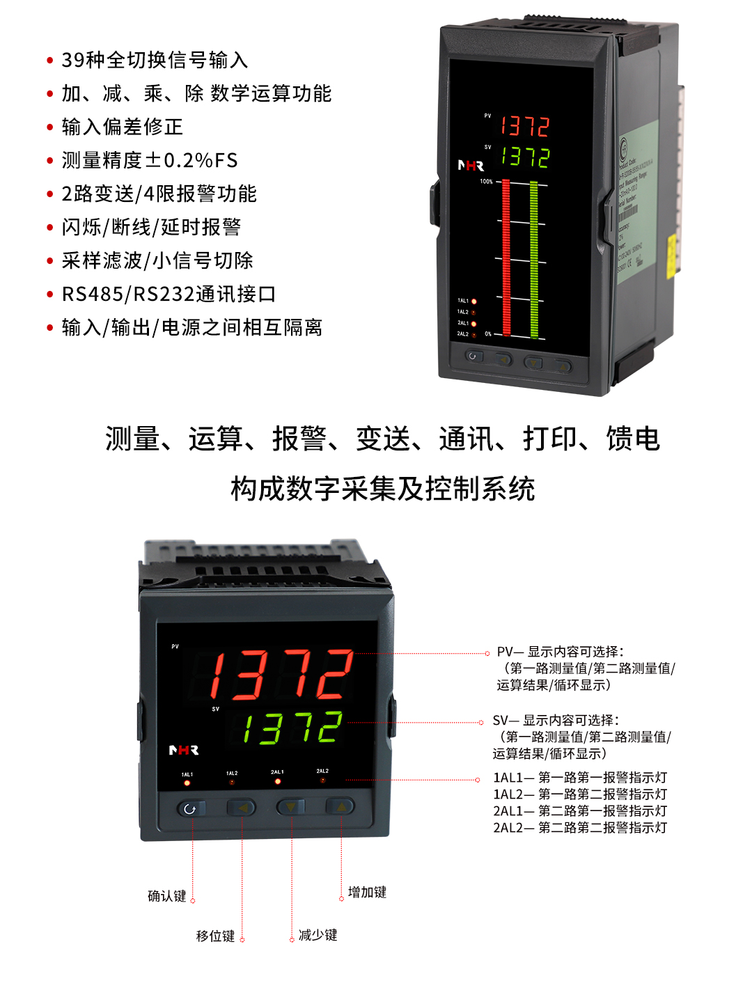 虹潤(rùn)公司是專業(yè)生產(chǎn)數(shù)顯表的國(guó)家專精特新“小巨人”企業(yè),生產(chǎn)的智能雙路數(shù)顯儀表,具有全切換信號(hào)輸入,加減乘除數(shù)學(xué)運(yùn)算,高抗干擾,過(guò)壓過(guò)流保護(hù),RS485/RS232通訊等特點(diǎn)。產(chǎn)品獲得巡回檢測(cè)顯示方法及裝置、儀表殼體等2項(xiàng)國(guó)家發(fā)明專利,主持起草工業(yè)過(guò)程控制系統(tǒng)用模擬輸入兩位或多位輸出儀表、物聯(lián)網(wǎng)智能溫度儀表通用技術(shù)條件等2項(xiàng)國(guó)家標(biāo)準(zhǔn),,以及通信系統(tǒng)多通道數(shù)據(jù)采集控制終端規(guī)范軍用標(biāo)準(zhǔn),參與國(guó)際5G標(biāo)準(zhǔn)制定,取得雙回路數(shù)字顯示控制儀表等3項(xiàng)相關(guān)軟件著作權(quán)。產(chǎn)品廣泛應(yīng)用于電力、石化、冶金、化工、造紙、食品、輕工、制藥、熱處理、水處理、機(jī)械配套等各種工業(yè)現(xiàn)場(chǎng)。